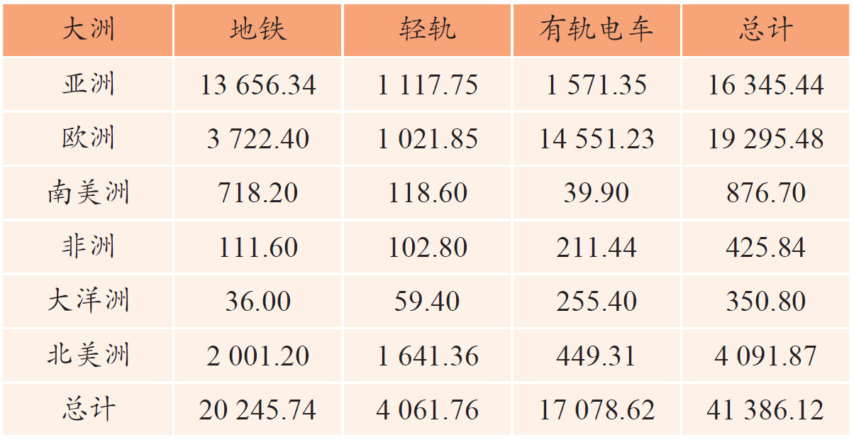உலகின் முக்கிய கண்டங்களில் உள்ள நகர்ப்புற ரயில் போக்குவரத்தின் ஒட்டுமொத்த அளவை படம் 1 காட்டுகிறது (குறிப்பு: ரஷ்யாவில் உள்ள அனைத்து நகரங்களும் கணக்கீட்டிற்காக ஐரோப்பாவாக வகைப்படுத்தப்பட்டுள்ளன). சுரங்கப்பாதைகள் மற்றும் டிராம்கள் உலகளவில் நகர்ப்புற ரயில் போக்குவரத்தின் முக்கிய வகைகளாகும், மேலும் உலகளாவிய நகர்ப்புற ரயில் போக்குவரத்து முக்கியமாக யூரேசியாவில் குவிந்துள்ளது, சுரங்கப்பாதைகள் முக்கியமாக ஆசிய நாடுகளில் விநியோகிக்கப்படுகின்றன.[1]