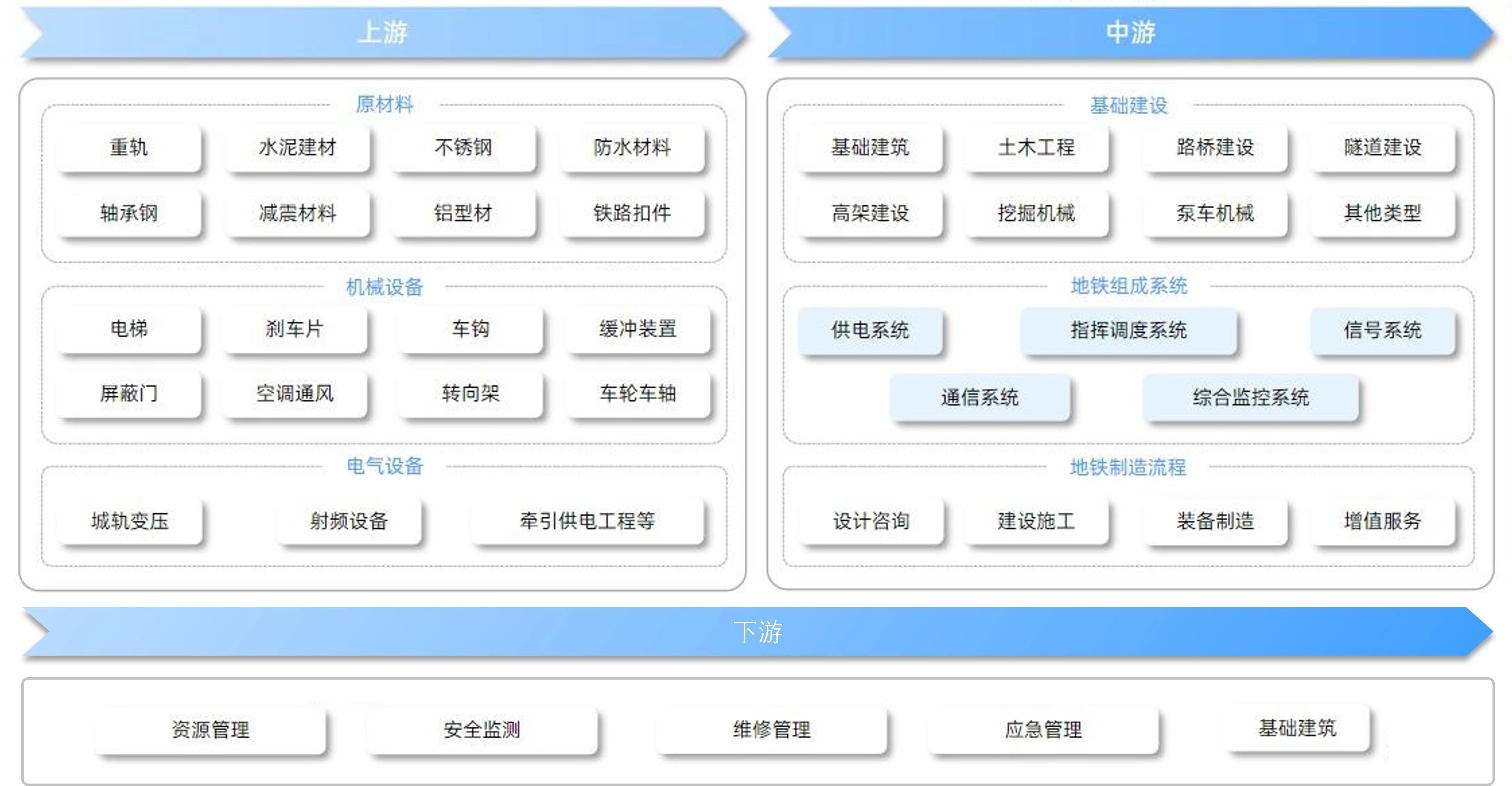 ரயில் போக்குவரத்து நகர்ப்புற தொழில்களை இணைக்கிறது, தொழில்துறை சங்கிலியின் விரிவாக்கத்தை ஊக்குவிக்கிறது மற்றும் உபகரண உற்பத்தி மற்றும் தொழில்நுட்ப R&D போன்ற துணைத் தொழில்களின் விரைவான வளர்ச்சியை உந்துகிறது. சுரங்கப்பாதை தொழில்துறை சங்கிலி படம் 3 இல் காட்டப்பட்டுள்ளது, அங்கு அனைத்து இணைப்புகளும் ஒன்றுக்கொன்று சார்ந்துள்ளது மற்றும் நகர்ப்புற ஒருங்கிணைப்புகள் மற்றும் பெருநகரங்களின் பொருளாதார வளர்ச்சியை இயக்குகிறது.[2]