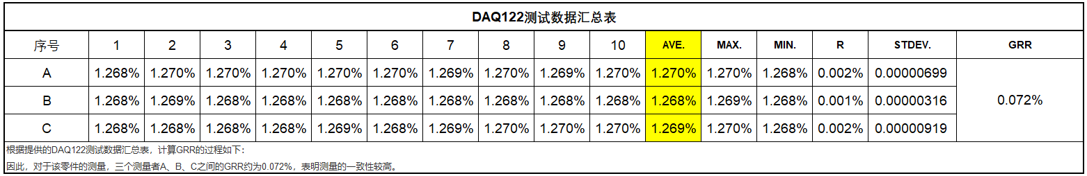 தேர்ந்தெடுக்கப்பட்ட தரவு கையகப்படுத்தல் அட்டை தேவைகளைப் பூர்த்திசெய்கிறதா என்பதை உறுதிசெய்ய, ME குழு அதைச் சோதித்தது. A, B மற்றும் C ஆகிய மூன்று அளவீடுகளில் சுமார் 0.072% GRR உடன், தேர்ந்தெடுக்கப்பட்ட தரவு கையகப்படுத்தல் அட்டை சிறந்த நிலைத்தன்மையைக் கொண்டுள்ளது என்பதை பகுப்பாய்வு காட்டுகிறது.