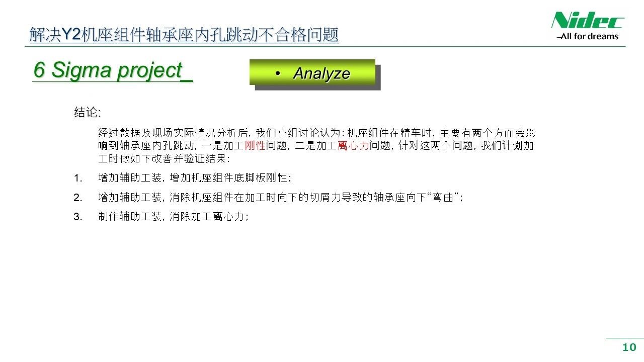 குழுவானது PFMEA (செயல்முறை தோல்வி முறை மற்றும் விளைவுகள் பகுப்பாய்வு) மற்றும் மீன் எலும்பு வரைபடங்கள் போன்ற பகுப்பாய்வுக் கருவிகளைப் பயன்படுத்துகிறது. இதில் தரவுகளின் விநியோகம், போக்குகளை மாற்றுதல், அவுட்லையர்களை அடையாளம் காணுதல், செயல்முறை மாறிகளுக்கு இடையிலான உறவை பகுப்பாய்வு செய்தல் மற்றும் சாத்தியமான சிக்கல்களின் மூல காரணங்களை தீர்மானித்தல் ஆகியவை அடங்கும். சிக்கல்கள் மற்றும் காரணங்களுக்கிடையேயான தொடர்பை நிறுவுவதன் மூலம், குழு சிக்கலின் தன்மையைப் பற்றிய ஆழமான புரிதலை உருவாக்கலாம் மற்றும் பயனுள்ள தீர்வுகளை உருவாக்குவதற்கான அடித்தளத்தை அமைக்கலாம். எடுத்துக்காட்டாக, தாங்கி இருக்கையின் உள் துளையின் ரன்அவுட் தரவின் ரேடார் விளக்கப்படத்தின் பகுப்பாய்வு மூலம், இந்த சிக்கலின் காரணங்கள் எந்திர விறைப்பு மற்றும் ரன்அவுட்டில் மையவிலக்கு விசையை எந்திரத்தின் செல்வாக்கு ஆகியவை அடங்கும் என்று நாம் முடிவு செய்யலாம். DOE (சோதனைகளின் வடிவமைப்பு) கொள்கையின்படி, காரணக் கருதுகோள் சரியானதா என்பதைச் சரிபார்க்க ஒரு முன்னேற்றத் திட்டம் வடிவமைக்கப்பட்டுள்ளது, பின்னர் மூல காரணம் கண்டறியப்பட்டது.