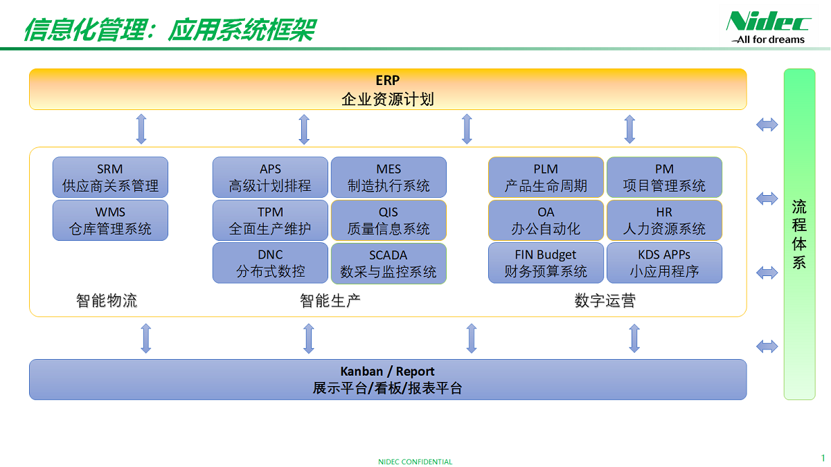 Nidec Elevator Motors SRM (சப்ளையர் உறவு மேலாண்மை), MES (உற்பத்தி செயல்படுத்தல் அமைப்பு), APS (மேம்பட்ட திட்டமிடல் மற்றும் திட்டமிடல்), WMS (கிடங்கு மேலாண்மை அமைப்பு) மற்றும் TPM (மொத்த உற்பத்திப் பராமரிப்பு) போன்ற அமைப்புகளை சுயாதீனமாக உருவாக்கியுள்ளது. இது தன்னியக்கமாக்கல், டிஜிட்டல் மயமாக்கல், மாடலிங், காட்சிப்படுத்தல், ஒருங்கிணைப்பு மற்றும் நுண்ணறிவு ஆகியவற்றின் மூலம் முழு அறிவார்ந்த உற்பத்தி முறையை உருவாக்குகிறது, சமச்சீர் உற்பத்தி திட்டமிடல் மற்றும் நெகிழ்வான ஸ்மார்ட் உற்பத்தியை மேம்படுத்துகிறது, மேலும் எதிர்காலத்தில் "கலங்கரை விளக்க தொழிற்சாலை" உருவாக்கப்படுவதற்கு உறுதியான அடித்தளத்தை அமைக்கிறது.